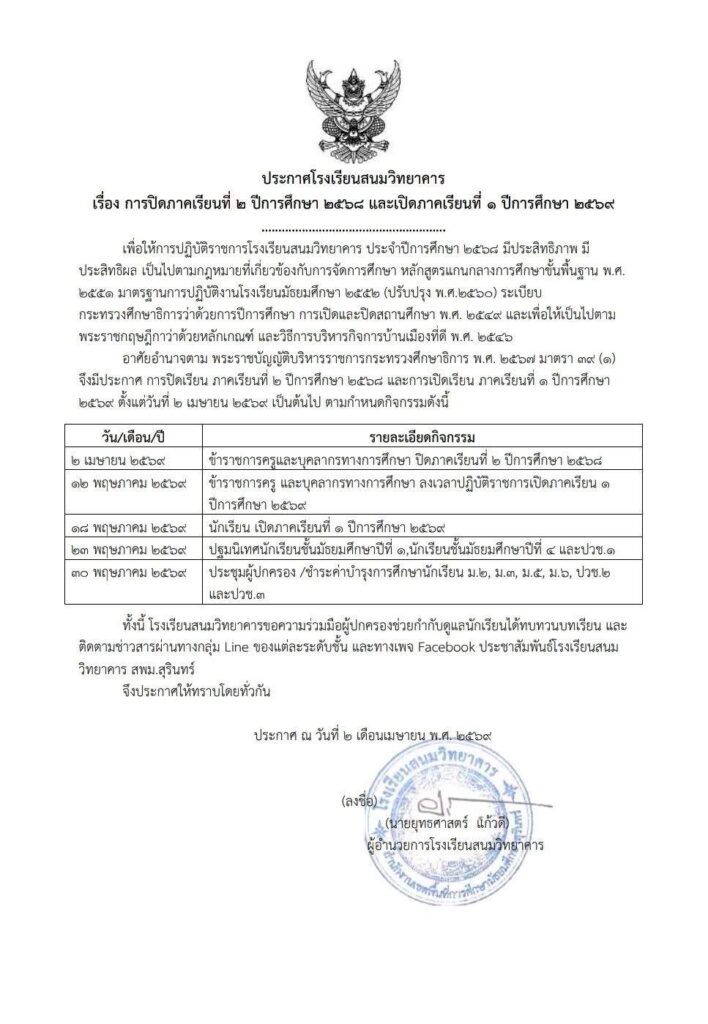 กำหนดการรับสมัครนักเรียนใหม่ ชั้นมัธยมศึกษาปีที่ 1 ชั้นมัธยมศึกษาปีที่ 4 และชั้นประกาศนียบัตรวิชาชีพชั้นปีที่ 1 ปีการศึกษา 2569 ระหว่างวันที่ 19 – 23 มีนาคม 2569 ตั้งแต่เวลา 08.30 – 16.00 น. ณ ห้องประชุมอาคาร 1 โรงเรียนสนมวิทยาคารโดยadminวันที่18 มีนาคม 256914 เมษายน 2026